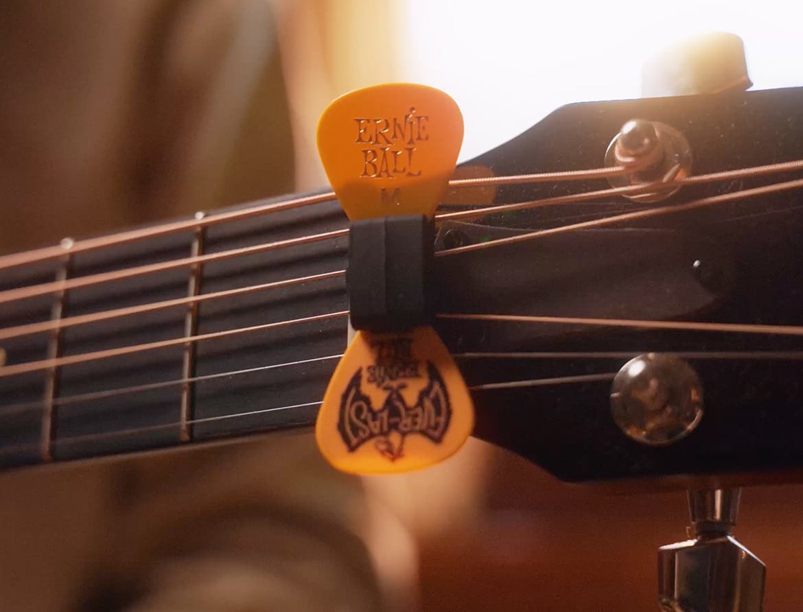 Ernie Ball Pick Holder to niewielki uchwyt na dwie kostki, który montujemy między strunami – wg producenta na główce gitary, ale nic nie stoi na przeszkodzie, żeby zamontować go za mostkiem.