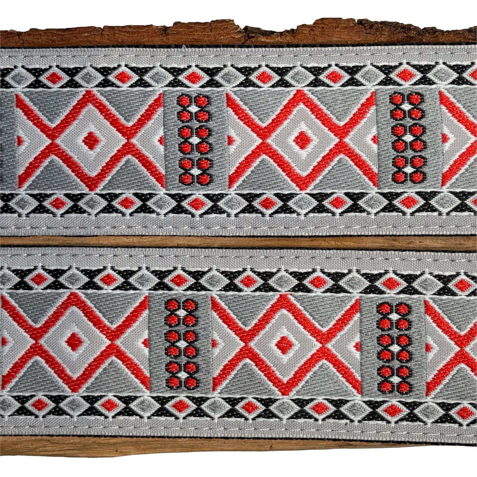 Pasek “Casino Couture” to jasny, szaro-czerwony pasek z geometrycznym wzorem. Choć nazwa jest sugestywna, sam wzór nie nawiązuje bezpośrednio do kasyna i kojarzonych z nim karcianych symboli. Szare, czarne i czerwone romby przeplatają się z rzędami czerwonych kółek. Trochę karty, trochę żetony… w każdym razie, jest elegancko.