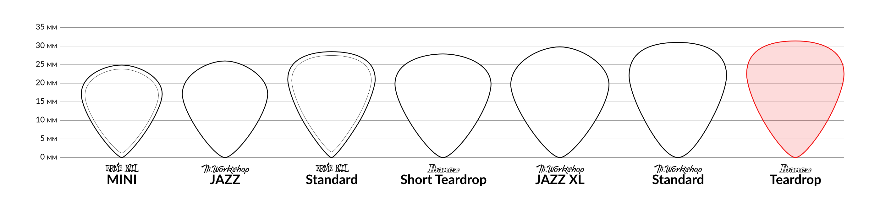 Kostki sygnowane przez Steve’a Vai’a mają kształt “Teardrop” – są to kostki bardzo zbliżone do M-Workshopowych kostek “Standard”. Różnica to wydłużony o ~0.5 mm i nieco ostrzejszy czubek kostki.