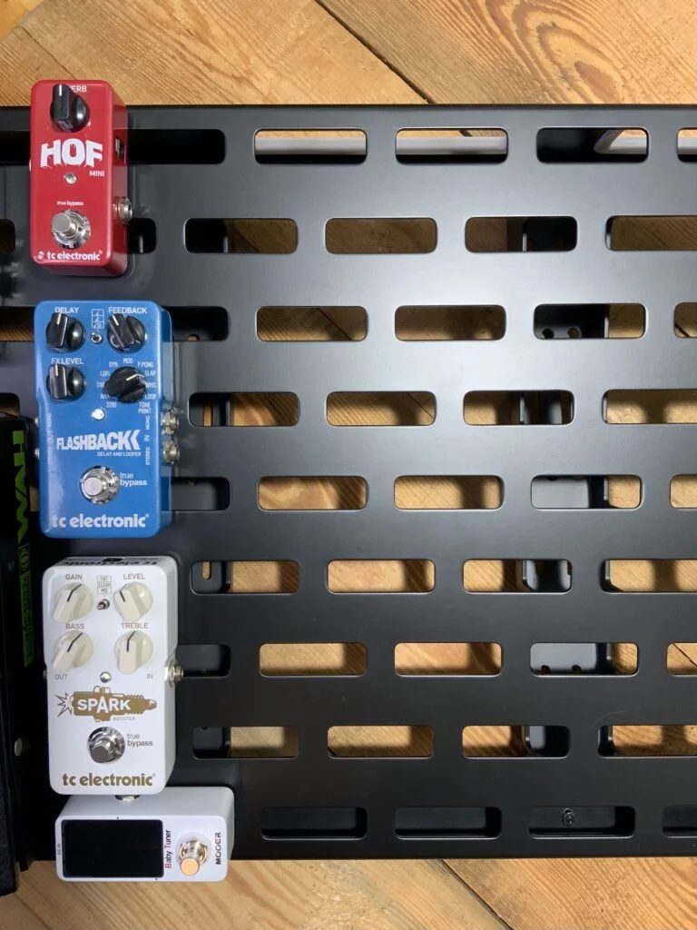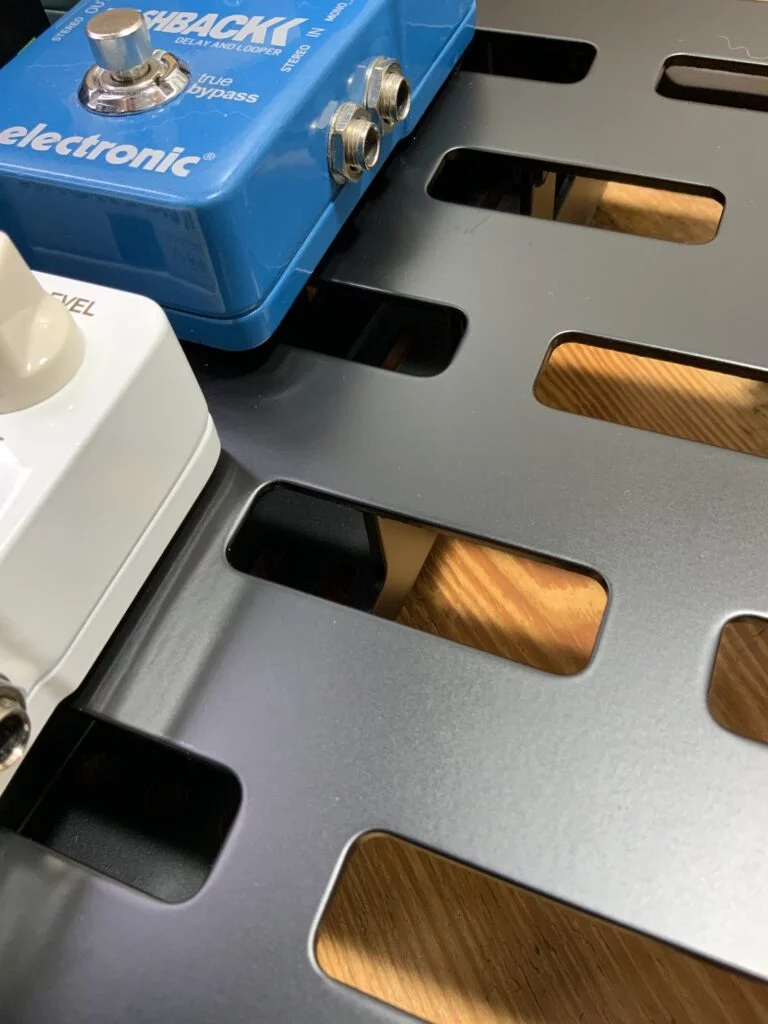 Pedalboardy Rockboard to bardzo solidne i przemyślane “podłogi”, wyposażone w szereg wygodnych rozwiązań, z bogatą ofertą dodatkowych akcesoriów. W całej linii pedalboardów znajdują się wersje zarówno dla początkujących gitarzystów/-ek, jak i dla tych z pokaźnym zestawem efektów. Płyta wierzchnia pedalbordu nachylona jest pod niewielkim kątem (~9°), co ułatwia naciskanie przycisków na efektach. Sama płyta posiada regularnie rozmieszczone otwory o wysokości 18 mm i szerokości 60 mm lub 98 mm. Taki układ pozwala na bezproblemowe rozmieszczenie efektów oraz poprowadzenie okablowania.